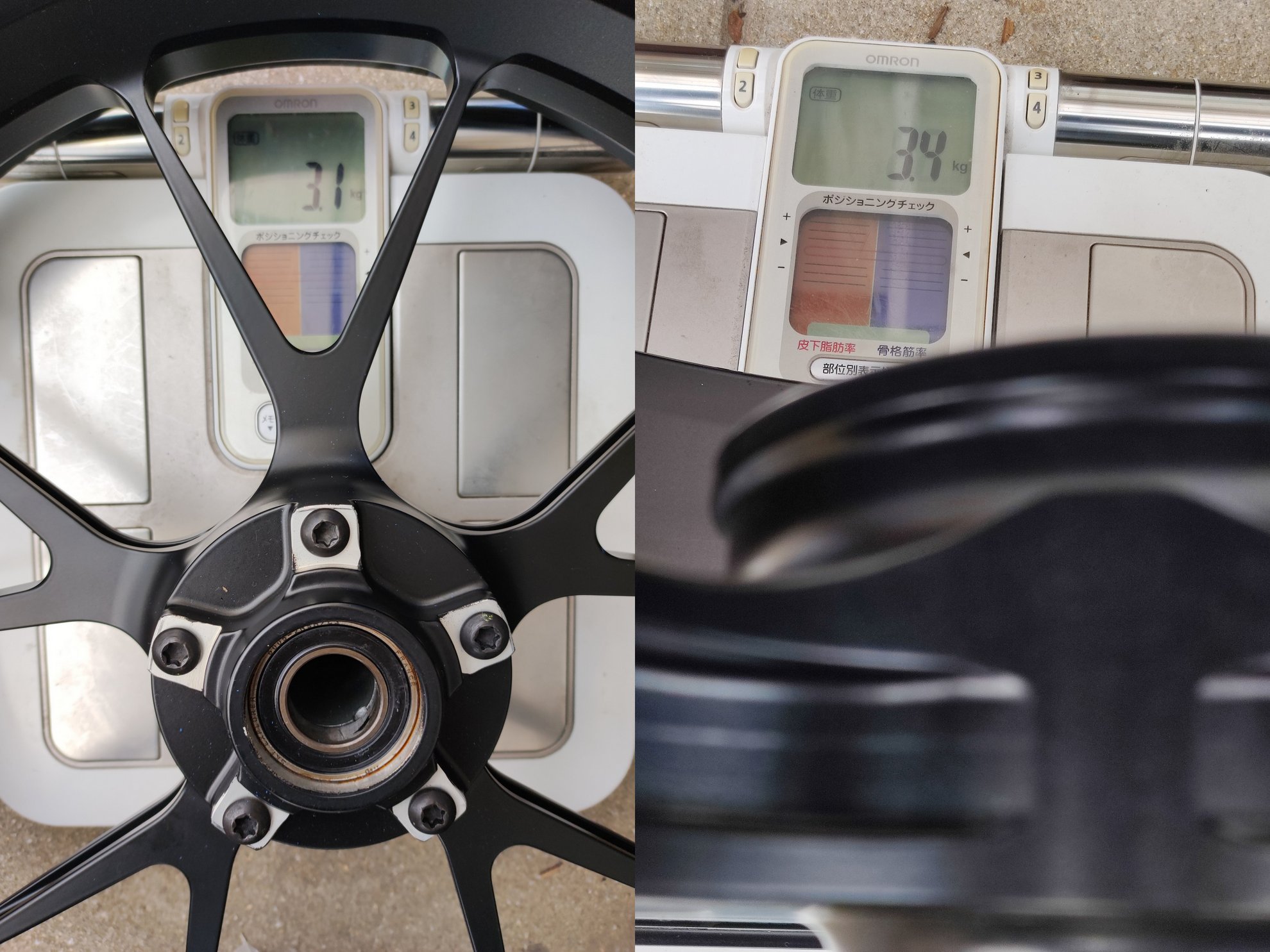 オフセットハブスペーサーの装着の確認と体重計でアルミ鍛造ホイールの重量を測定しました。なかなか軽いですね。